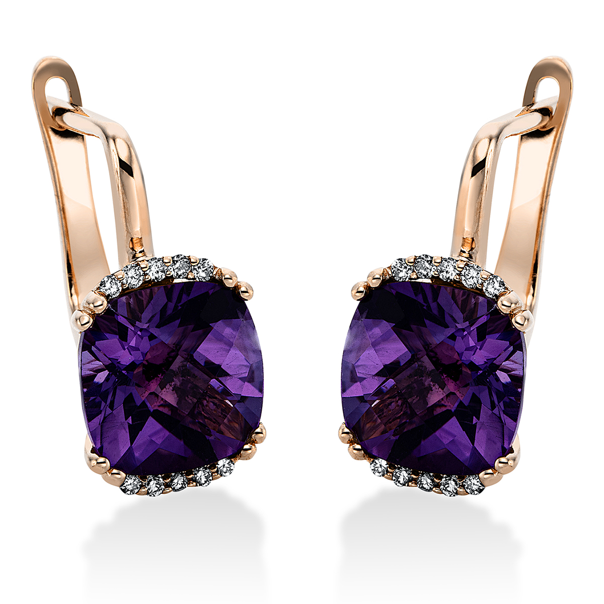 Ohrschmuck 4er-Krappe 14 kt RG, 20 Brillanten 0,09 ct, TW-vsi, 2 Amethyste 3,99 ct lila