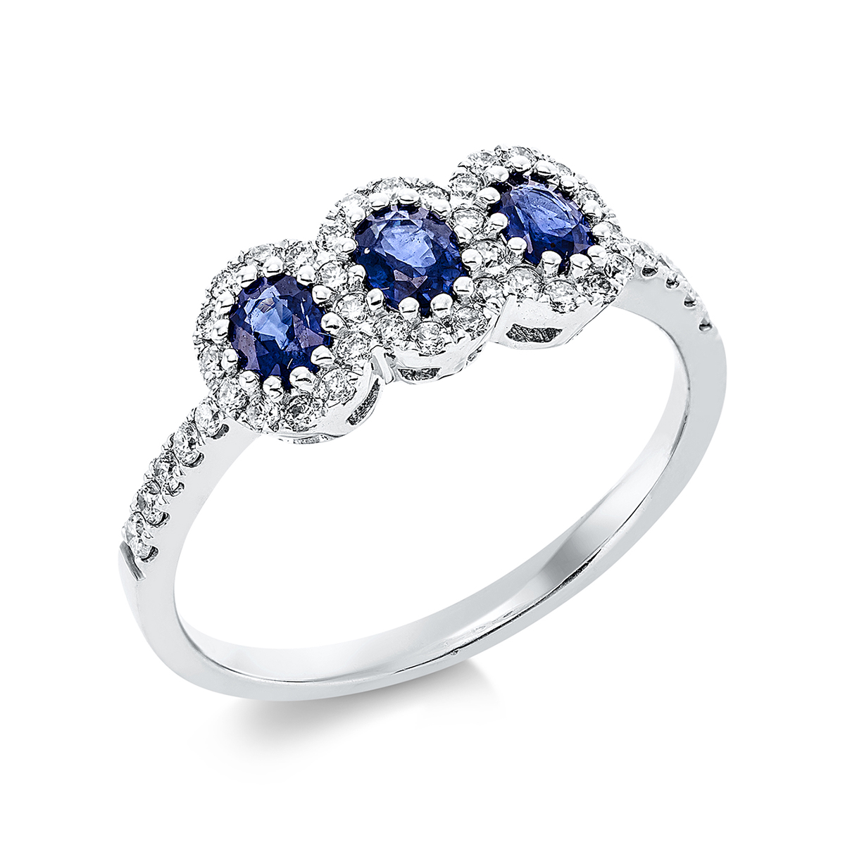 Ring Zarge 18 kt WG, 4 Brillanten 0,05 ct, TW-pi, 38 Brillanten 0,24 ct, TW-pi, 3 Saphire 0,63 ct blau, H:13,5 mm, B:6,6 mm, Weite:54